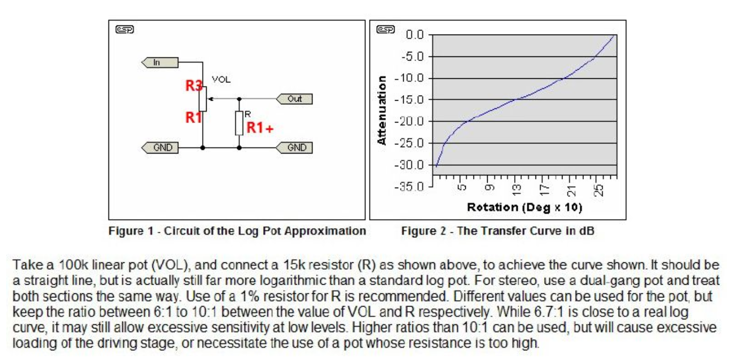 앞의 그림에서도 측정치는 감쇄(Attenuation)값을 측정한 것이다. 오디오의 볼륨은 전압을 조정하는 것이다. 저항을 활용한 전압을 조정하는 것이다. 그래서 저항들을 어떻게 구성하던지, 볼륨으로 사용되는 신호의 전압이 Log곡선을 그리면되는 것이다. 가변저항자체가 A타입이라면, 물리적 저항의 변화도가 전압의 변화도에 영향을 미치지만, 저항 하나를 추가 구성하여, B타입을 A타입으로 바꾸는 것은 저항값을 바꾸는 것이 아니라, 전압의 변화가 Log곡성을 그리도록 하는 것이다. 물론 더 정확히는 오디오 신호 자체의 감쇄(Attenuation)을 조정하는 것이다.