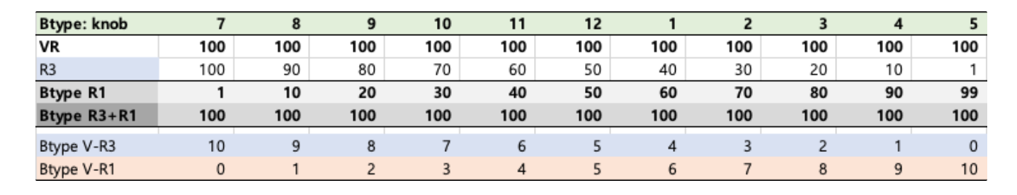 이제 Excel로 무식한 시뮬레이션을 해보았다. 먼저 B Type에 대한 시뮬레이션이다. 볼륨을 CCW(min)에 두고 조금씩 변경하면서, CW(max)로 옮겨가는 Case를 구성하고, 각 Case별로 R3,R1값의 변화와 그에 따르는 출력단 1~2에 걸리는 전압을 계산해 보았다. 계산이 편하도록 입력 전압은 10V로 가정하고 계산하였다. (노브의 숫자는 시계의 시침 방향으로 가정함)