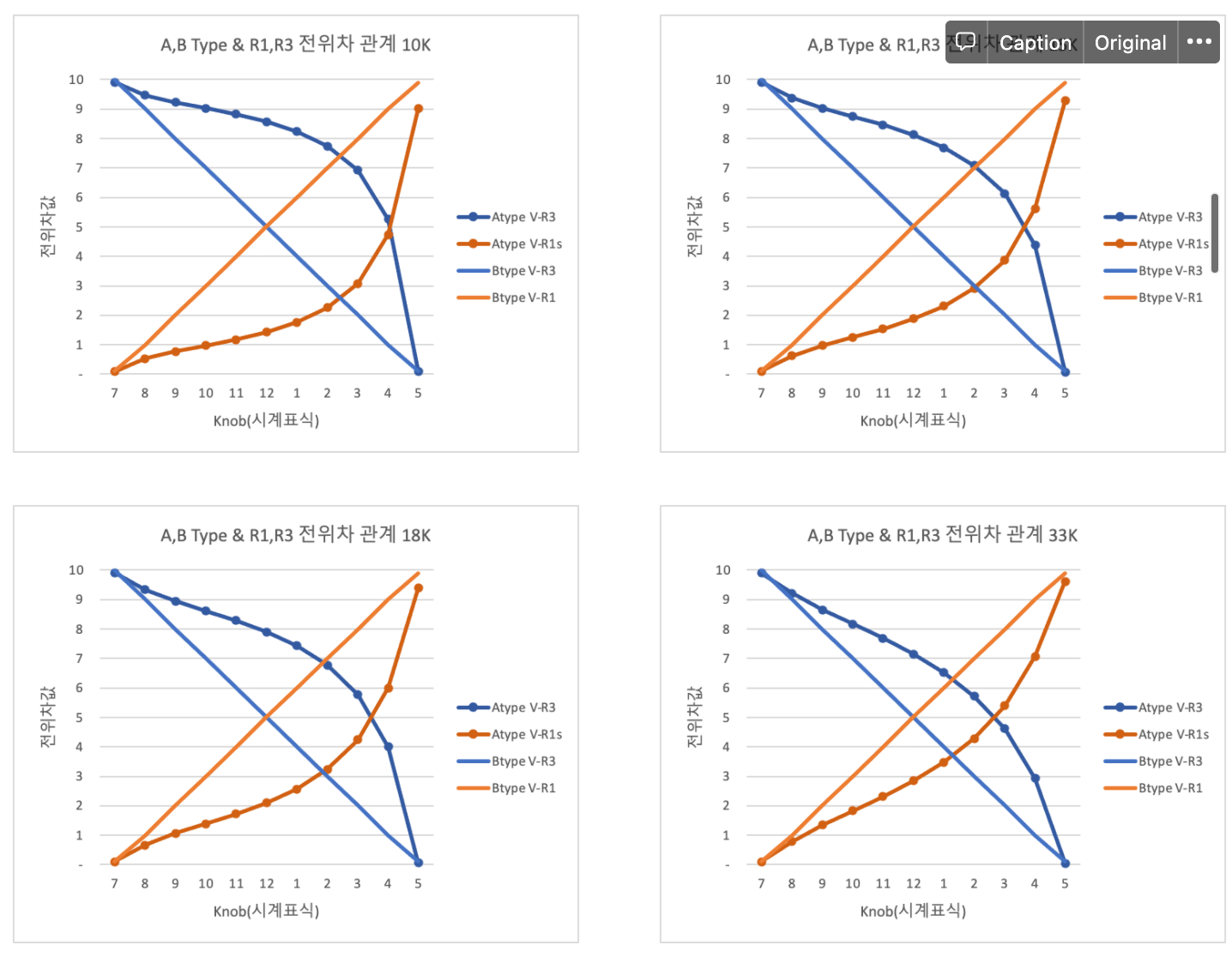 왼쪽의 그래프는 노브변화에 따른 B타입의 전체저항값과 R1의 저항값, 그리고 B타입을 수정한 A타입의 전체저항값과 R1s(R1,R1+합성저항)의 저항값을 그래프로 표현하고 있다. 그래프 자체의 특징을 보면, B타입에서는 위쪽에 고정된 꼭지점이 수정 A타입에서는 아래로 끄집어 내려온 모습이다.